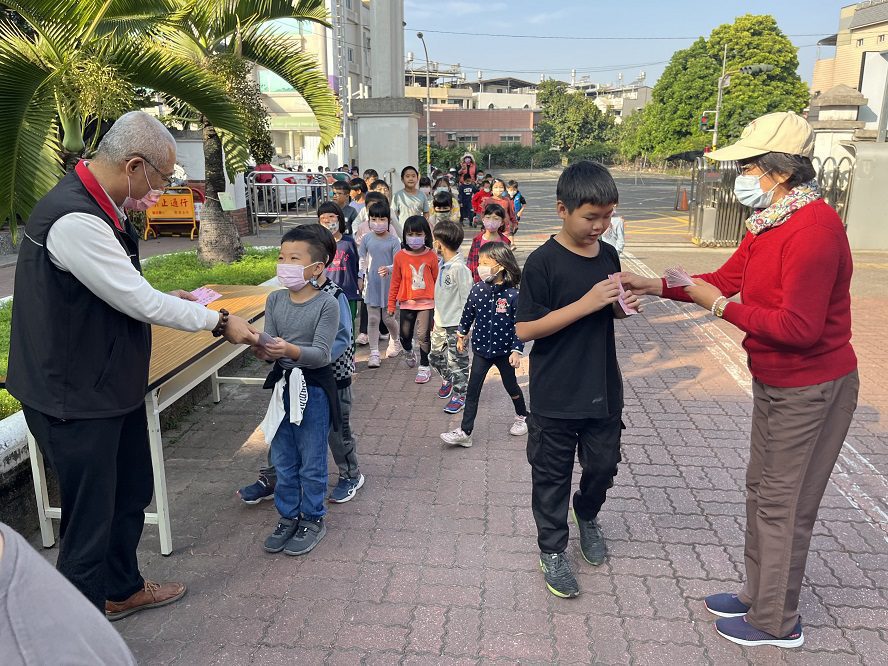 回到學校,林育妃校長及陳景興會長在校門口發放祝福卡,卡片上黏貼一塊錢,意喻「一元復始,萬象更新」,期待學生把握新的一年,好好努力,讓自己有更好的表現。
