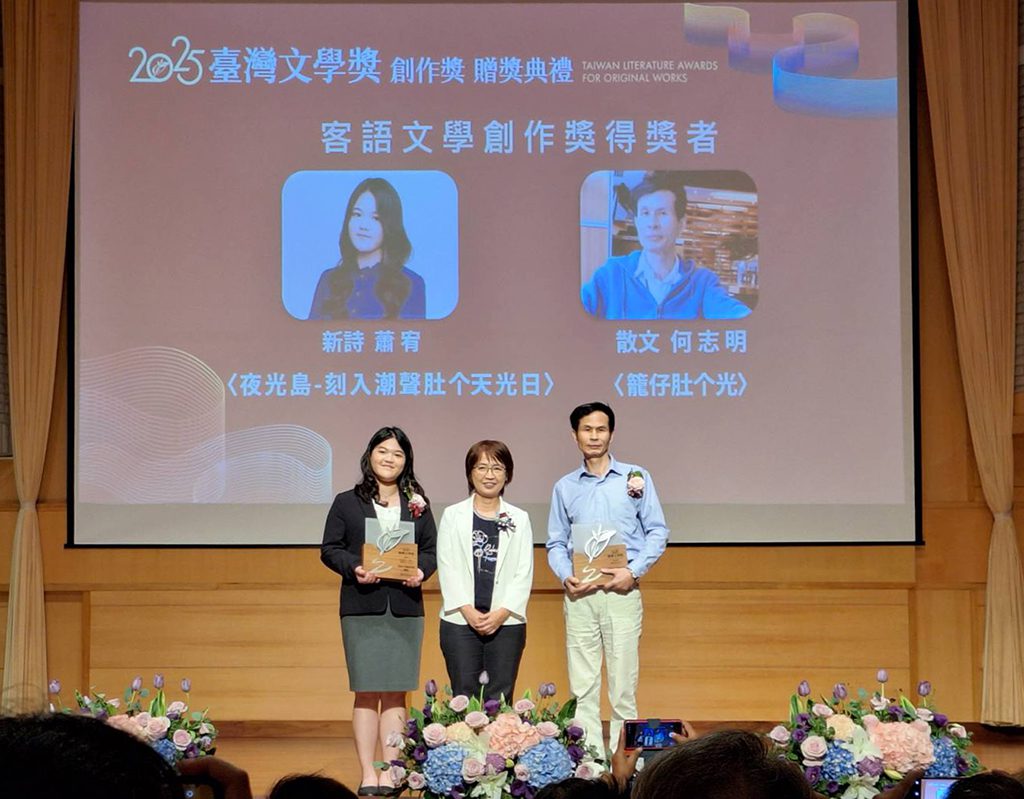 客語文學新詩獎由年僅18歲、剛剛進入大學的蕭宥以〈夜光島──刻入潮聲肚个天光日〉獲得殊榮,評審邱湘雲盛讚其以簡潔語句描寫海潮與黎明、暗夜至天光,展現年輕創作者的詩性成熟與堅毅精神。蕭宥在台上以令人驚豔的流利客語表示,未來會持續筆耕記錄臺灣故事;散文獎得主何志明則以〈籠仔肚个光〉三度奪魁,這篇作品書寫單親兒子獨自照顧病父的長照歷程,深刻反映當代家庭結構與老化社會問題,情感層次豐富,備受評審肯定。