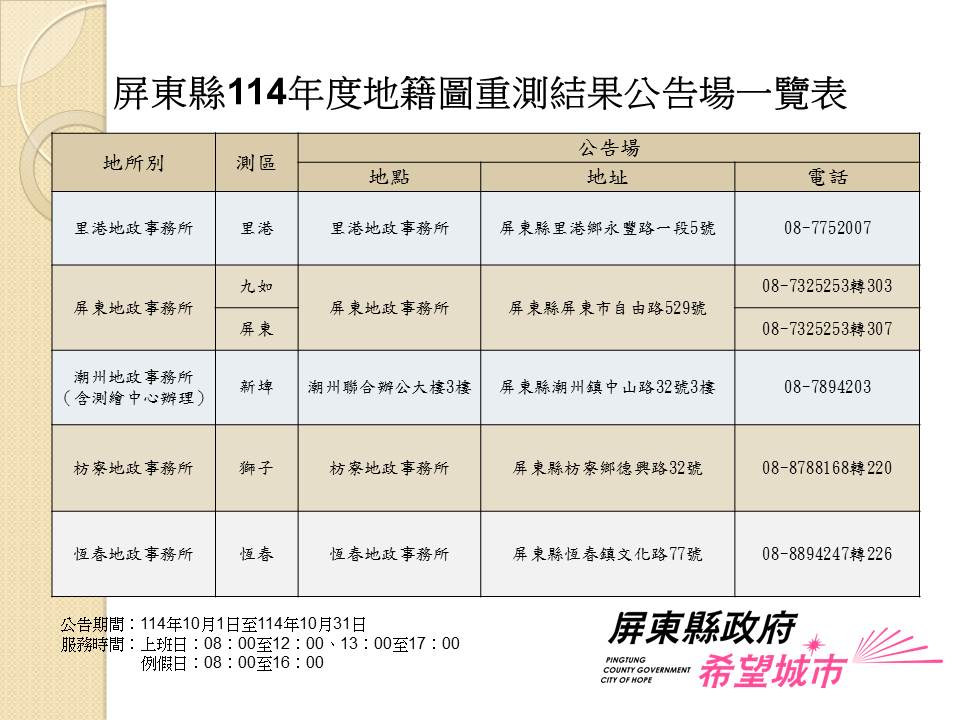 屏縣114年度地籍圖重測成果10/1公告 5處公告場提供閱覽服務