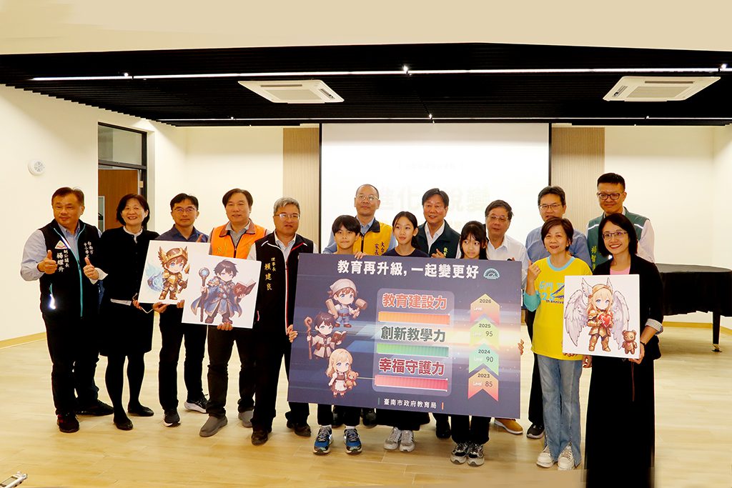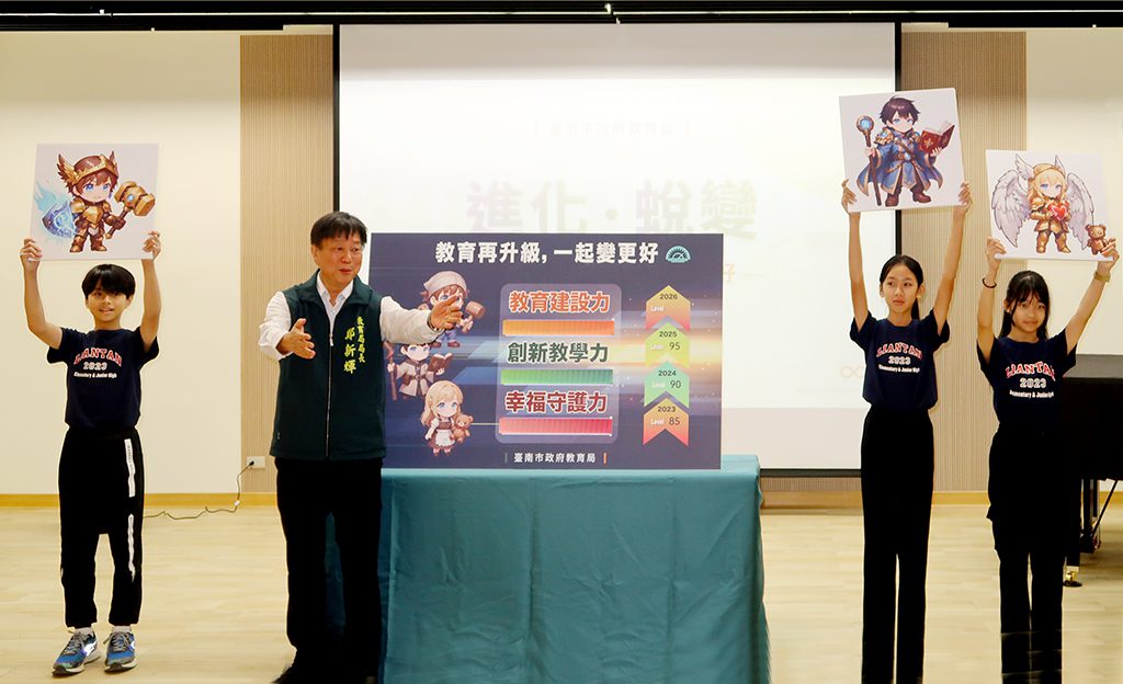 【記者吳玉惠/臺南報導】臺南市政府教育局於12月9日上午在蓮潭國中小舉行「進化.蛻變-教育再升級.一起變更好」2025年終成果發表會。今年為展現數位科技融入教育成果,發表會創新打造一場「劇場」般的沉浸式任務導覽。透過雙語學生司儀開場、具象化主題影片,教育局長鄭新輝專題簡報及「三力升級儀式」,帶領與會嘉賓實際走入教育現場,親身體驗「教育建設力、創新教學力、幸福守護力」三大關鍵力量如何推動臺南教育全面升級。