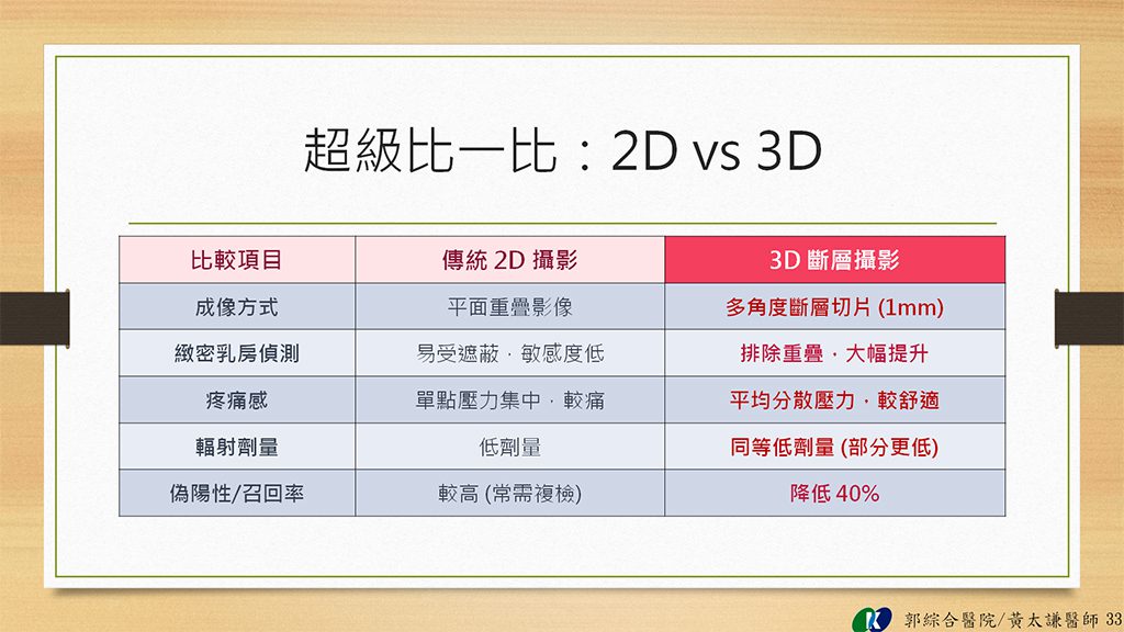 郭綜合醫院醫療副院長暨一般外科主治醫師黃太謙表示,3D 乳房攝影的本質革新則來自它的「逐層掃描」。醫師形容,「傳統 2D 就像看書的封面,字句全部重疊在一起;3D 則像把書一頁一頁翻開,看得清清楚楚。」在拍攝時,X 光球管會沿弧形軌道快速捕捉多角度影像,再重組成厚度僅 1mm 的薄層。這讓醫師可以逐層檢視乳房結構,大幅降低遮蔽問題,提高早期偵測的可能性。