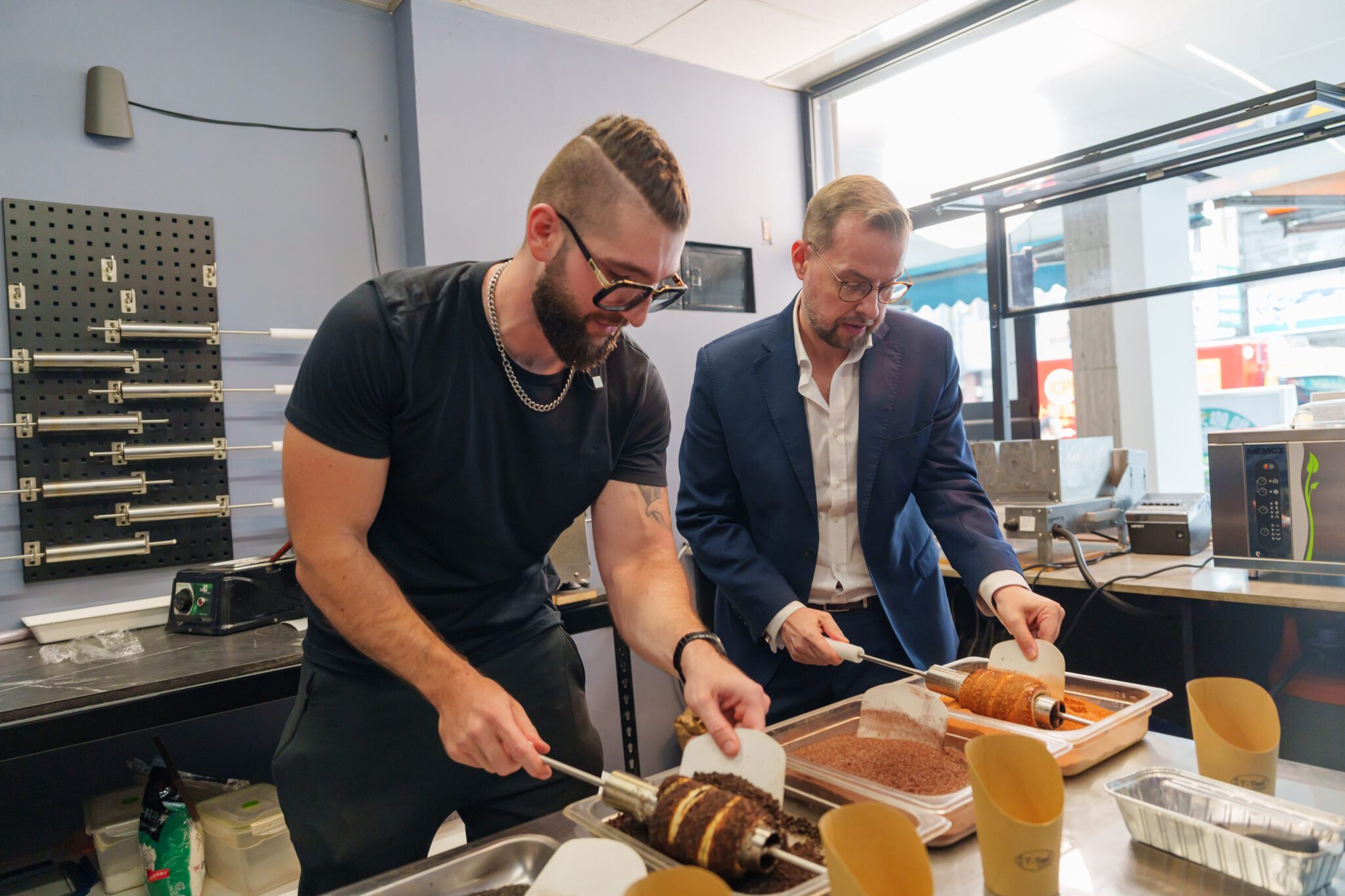 經發局表示,美食是打開城市魅力的最佳起點。行程首站來到北屯「堤捲 T-Roll」,老闆是因愛留在台中的捷克人,店內販售捷克節慶經典點心「煙囪捲」。史坦格代表一進門便以捷克語與老闆親切寒暄,還首次體驗手作煙囪捲,從捲麵糰到裹糖粉,體驗感十足。他笑稱:「看起來簡單,做起來可不容易!」但能在台中吃到家鄉味,讓他直呼以後一定要再訪。