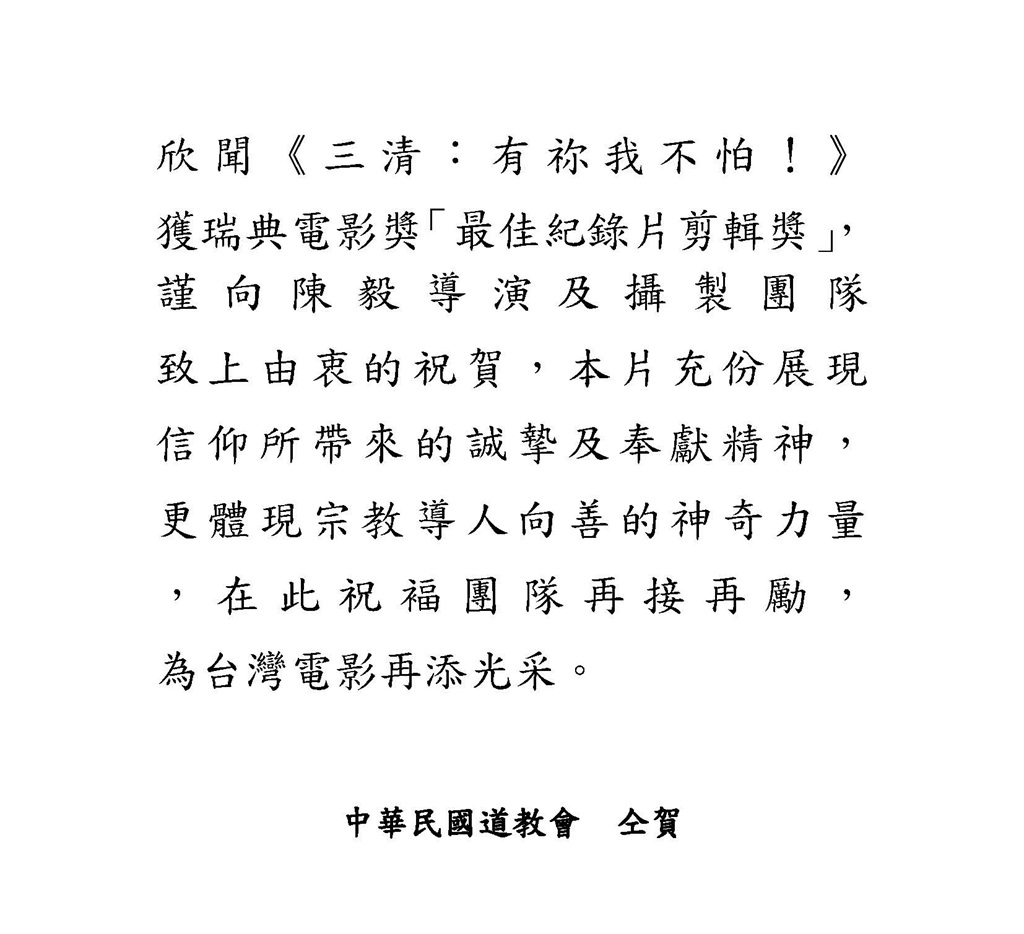 欣聞《三清:有祢我不怕!》獲瑞典電影獎「最佳紀錄片剪輯獎」,謹向陳毅導演及攝製團隊致上由衷的祝賀,本片充份展現信仰所帶來的誠摯及奉獻精神,更體現宗教導人向善的神奇力量,在此祝褔團隊再接再勵,為台灣電影再添光采。