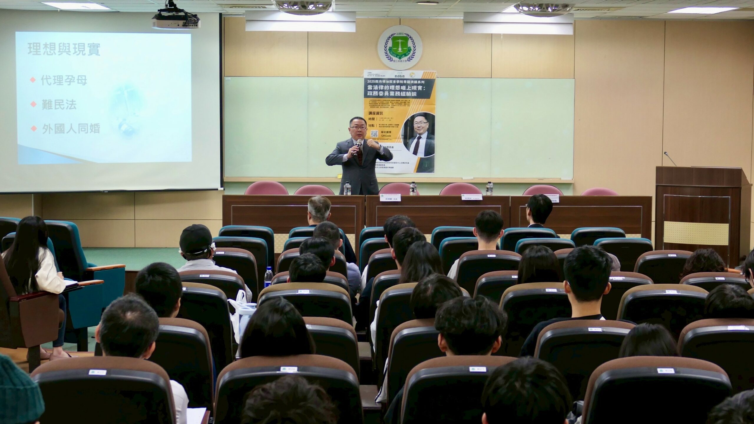 行政院南部聯合服務中心日前於國立高雄大學舉辦「2025南方領袖教育學院」專題演講,邀請具深厚法學背景的林明昕政務委員,以第一線政務經驗為題,與法學院師生分享法律理想與政策現實之間的拉鋸。活動吸引逾百位師生參與,透過實務案例剖析,讓青年世代更貼近公共政策決策的真實樣貌,現場交流氣氛熱烈。