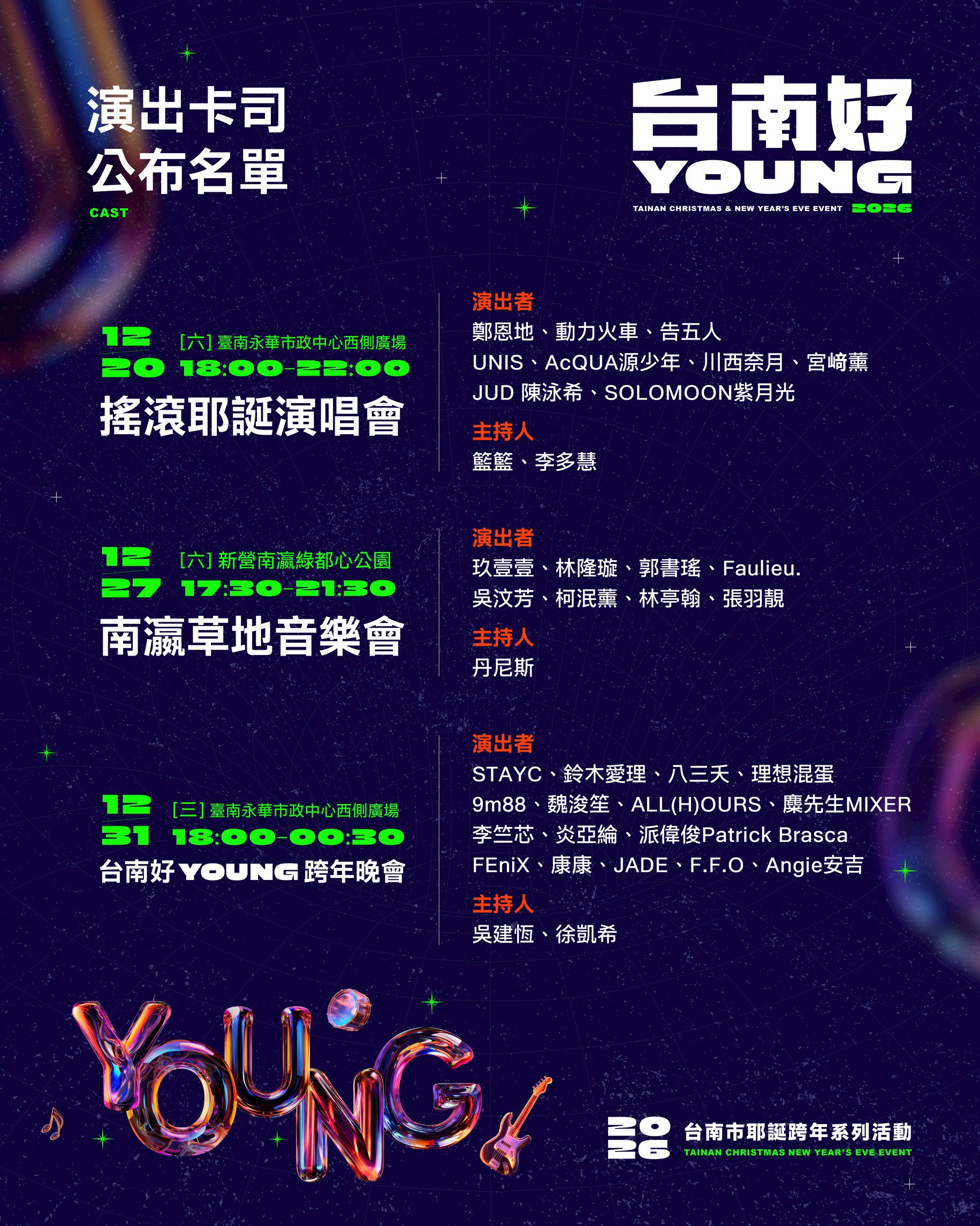▼台南市長黃偉哲揭曉「2026台南好young」跨年活動第二波卡司。