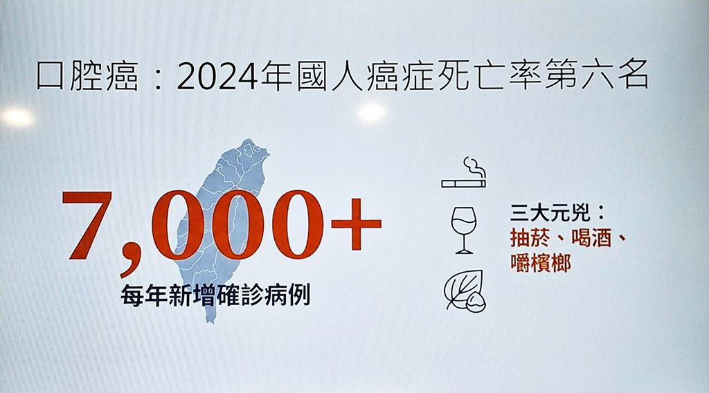 吳俊毅醫師表示,口腔癌連續多年位居台灣十大癌症死因,早期診斷與適當治療是影響口腔癌預後的關鍵因素。根據統計數據,口腔癌第一、第二期的五年存活率約可達到80%至90%,然而一但進展至第三、第四期,五年存活率則降至50%以下。口腔癌主要危險因子包含吸菸、喝酒及嚼食檳榔,其中三項合併者罹癌風險高達一般人的 123 倍。
