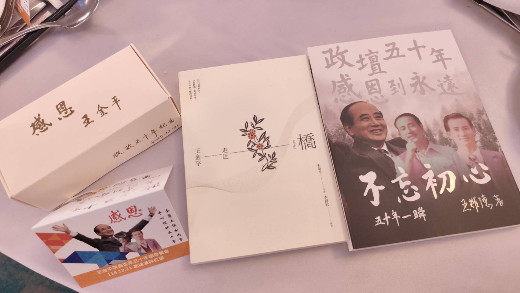 為回顧五十年從政歷程,主辦單位特別製作《不忘初心・五十年一瞬》紀念冊,並致贈鶯歌燒紀念「敬杯」,作為對與會者的感謝。這兩項紀念品,不僅具文化價值,更蘊含深層政治寓意。