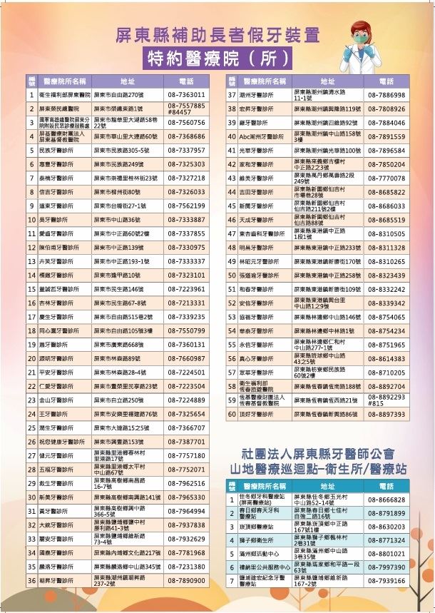 特約牙醫院所可至屏東縣政府衛生局(ptshb.gov.tw)→便民服務→便民服務整合申辦平台→65歲以上長者裝置假牙補助申請→相關檔案→115年特約醫療院所查詢。網址:https://onestop.pthg.gov.tw/eservice/apply_mode_directions2?itemId=1395