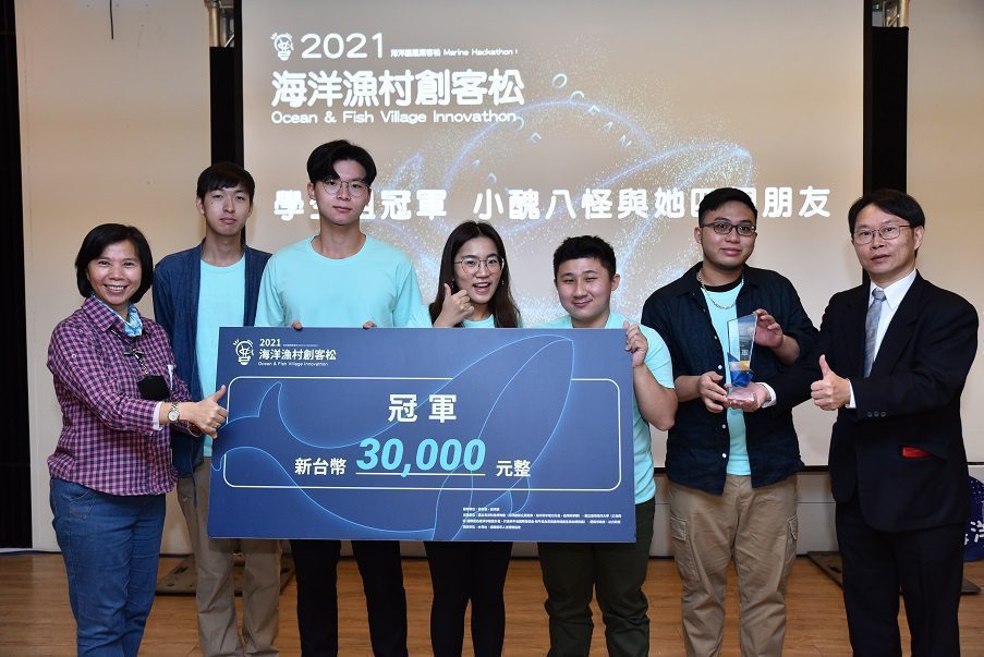 【記者范家豪/基隆報導】 由國立海洋科技博物館、國立臺灣海洋大學、基隆市政府、以力科技共同主辦的「2021海洋議題第二屆海洋漁村創客松競賽」,自今(110)年8月開始展開賽事,吸引了來自全省51隊參賽隊伍報名並展開為期2個月的緊密活動競賽後,昨(19)日於海科館進行優勝隊伍頒獎典禮,社會組冠軍由海洋大學教育研究所暨師資培育中心的師生與基市議員張淵翔和文史工作者林介佳共組的「浪紙回頭」拔得頭籌,學生組冠軍由國立臺灣師範大學地球科學系大學生所組的「小醜八怪與她四個朋友」獲得,冠軍隊伍各獲有30,000元之獎金,透過這次活動的展開與各競賽隊伍的發想與提出的解決方案,將海洋永續發展有更多的省思與推動可行性。